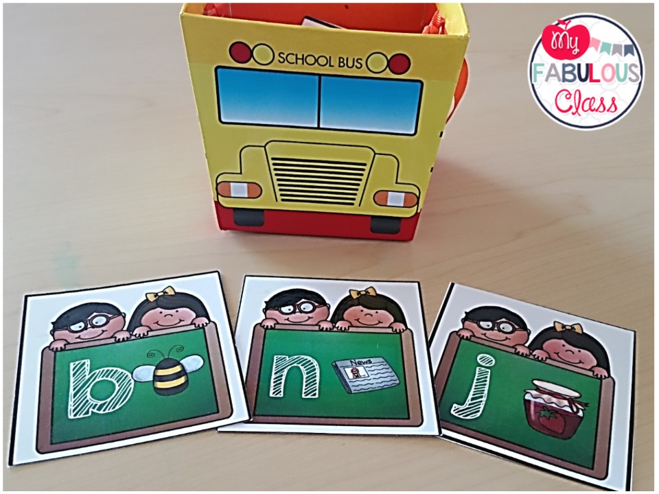 This game is a favorite for all of my groups. Students pull a card out of the bus and say the name of the letter or the sound, if they know it. I think it is important for kids to associate the letter with the picture and sound. Even if they are still working on letter ID, they will hopefully start to make the connection between the letter and the sound. The cardboard bus came from the Dollar Tree. The letter cards are also from my Back to School Word Work.